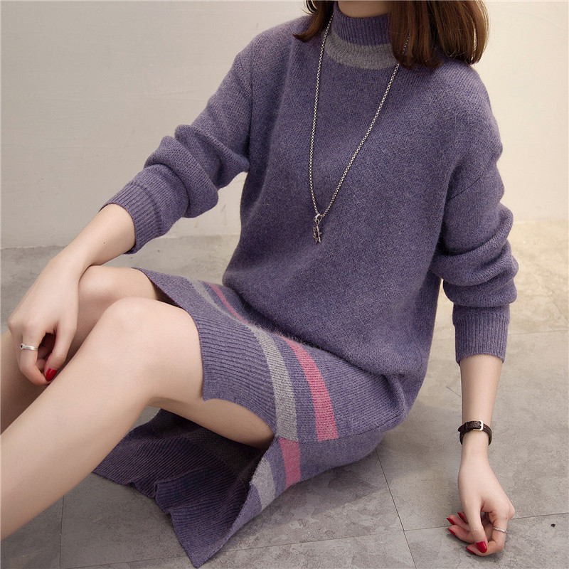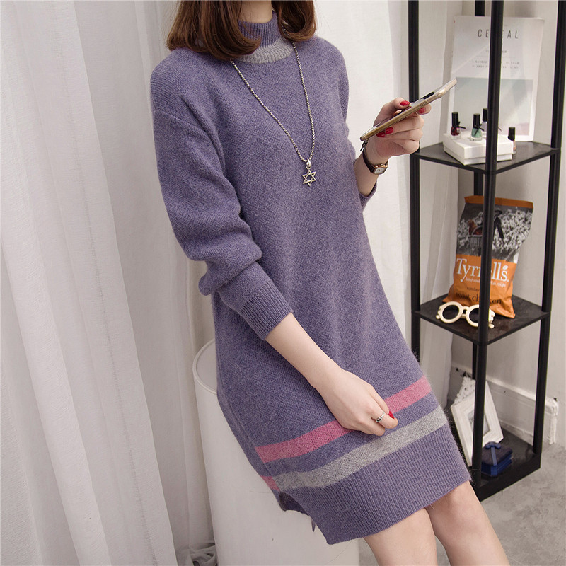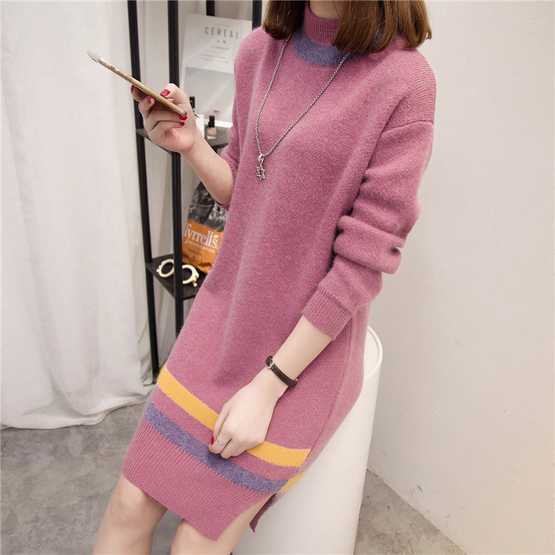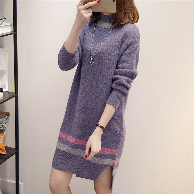 高領毛衣女秋冬套頭針織打底衫長袖女裝韓版寬松中長款毛衣裙加厚