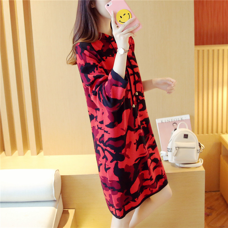 / 女裝冬裝新款潮迷彩針織衫套頭連帽外套毛衣女秋冬上衣中長款