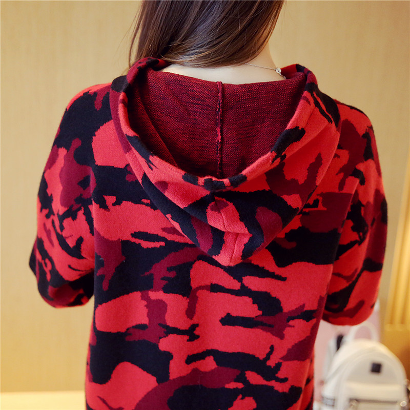 女裝冬裝新款潮迷彩針織衫套頭連帽外套毛衣女秋冬上衣中長款
