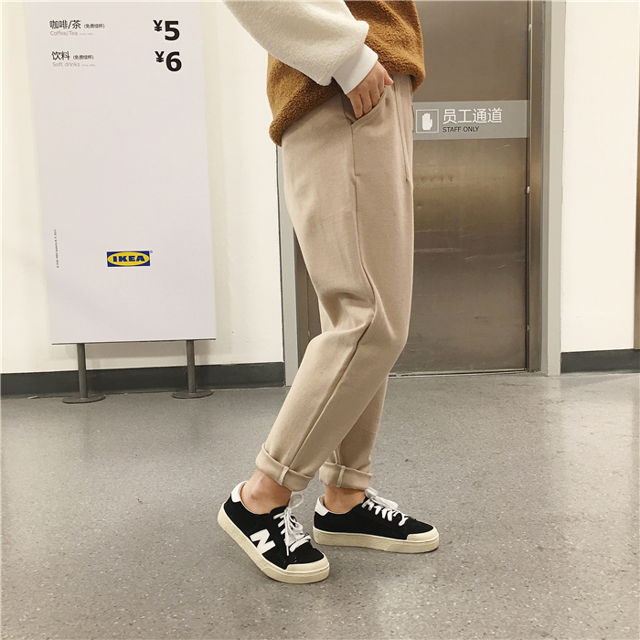 / 韓國chic秋冬款個性圓環裝飾加厚毛呢休閑褲長褲女學生哈倫褲