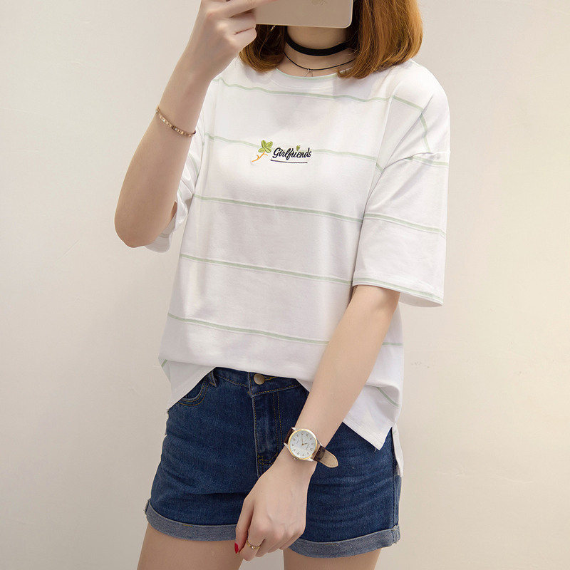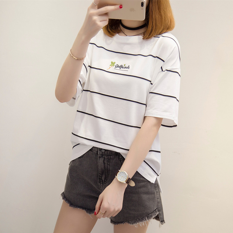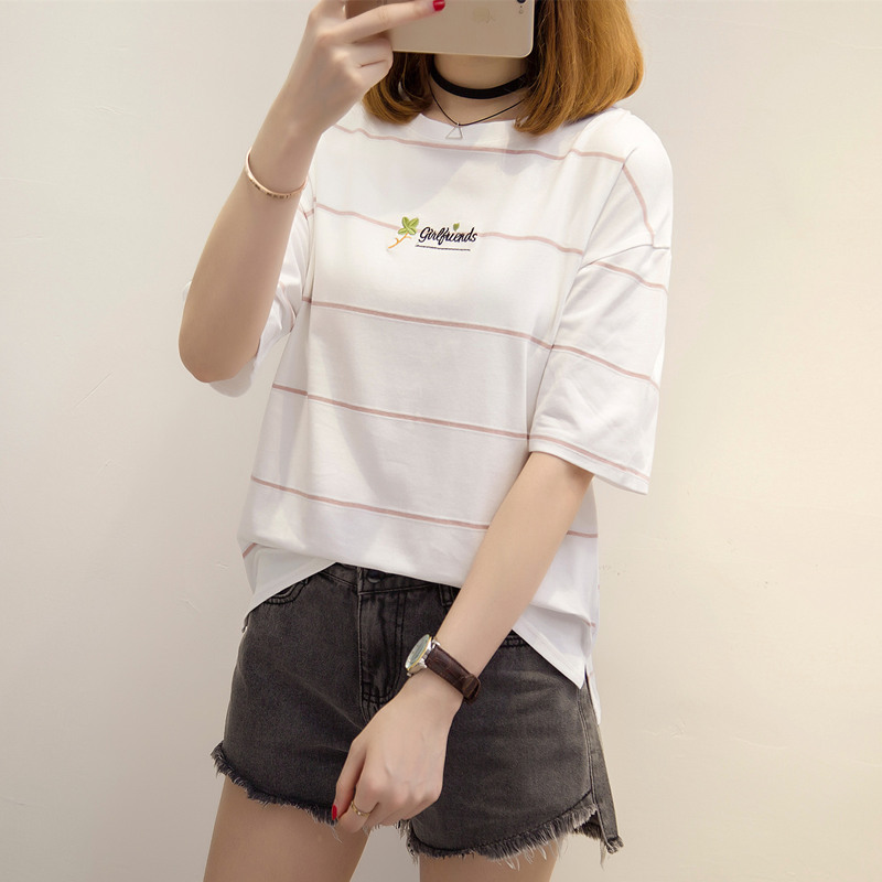 夏裝新款女寬松白色條紋t恤女韓版小清新上衣女夏體恤衫短袖