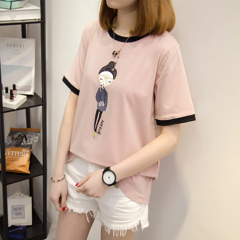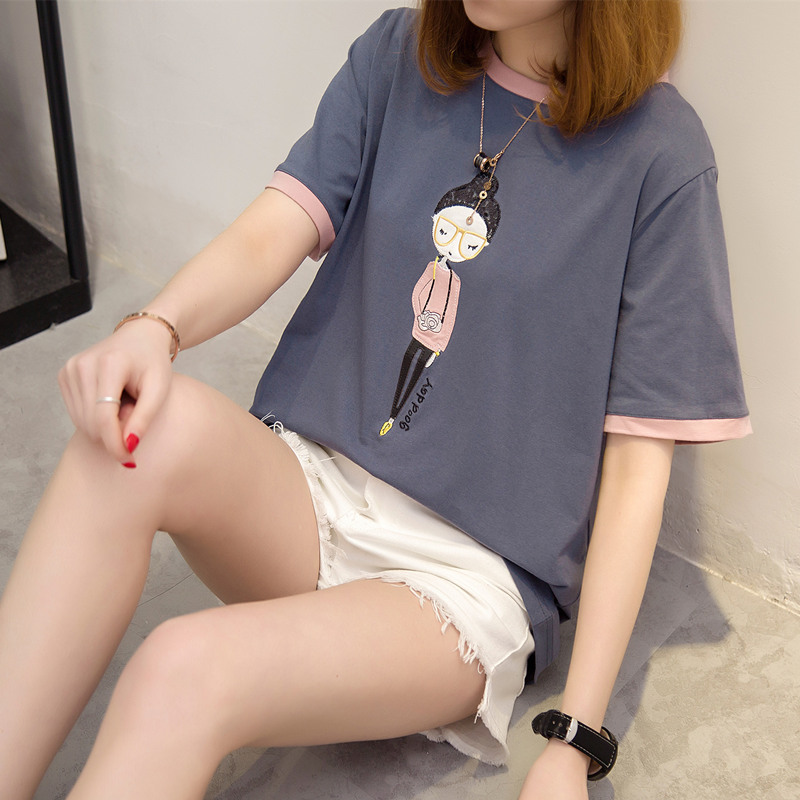 短袖t恤女寬松拼色小清新上衣女夏裝白色體恤衫韓版百搭新款