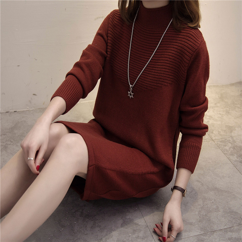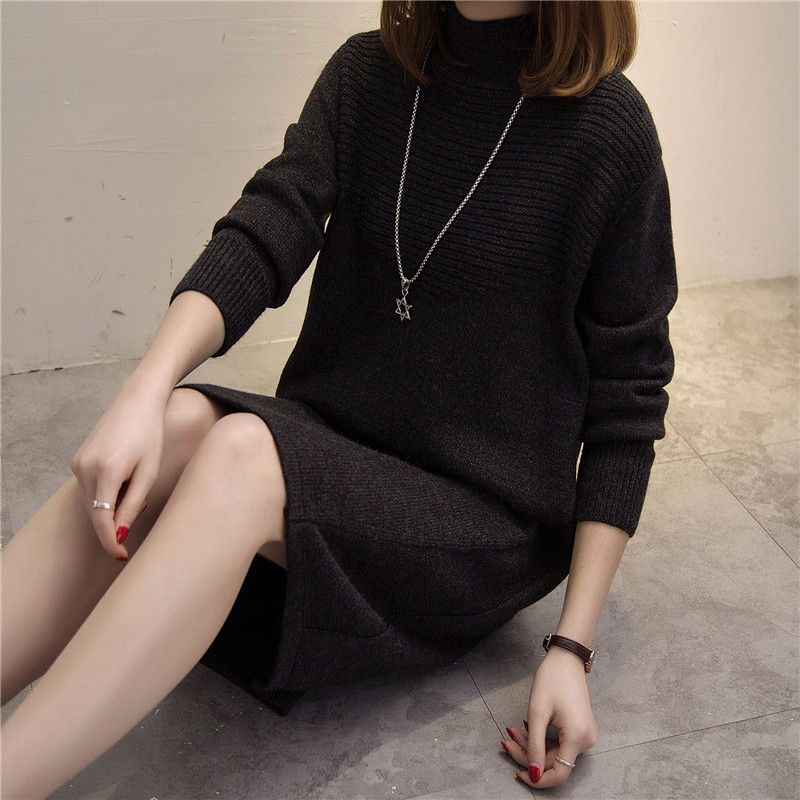 女裝冬裝新款潮韓版上衣寬松套頭女針織衫半高領中長款毛衣裙