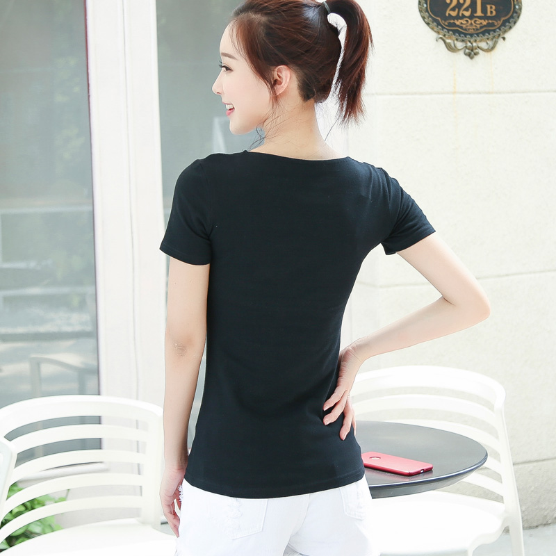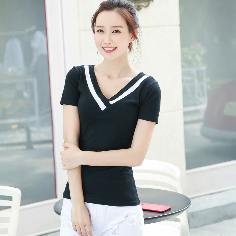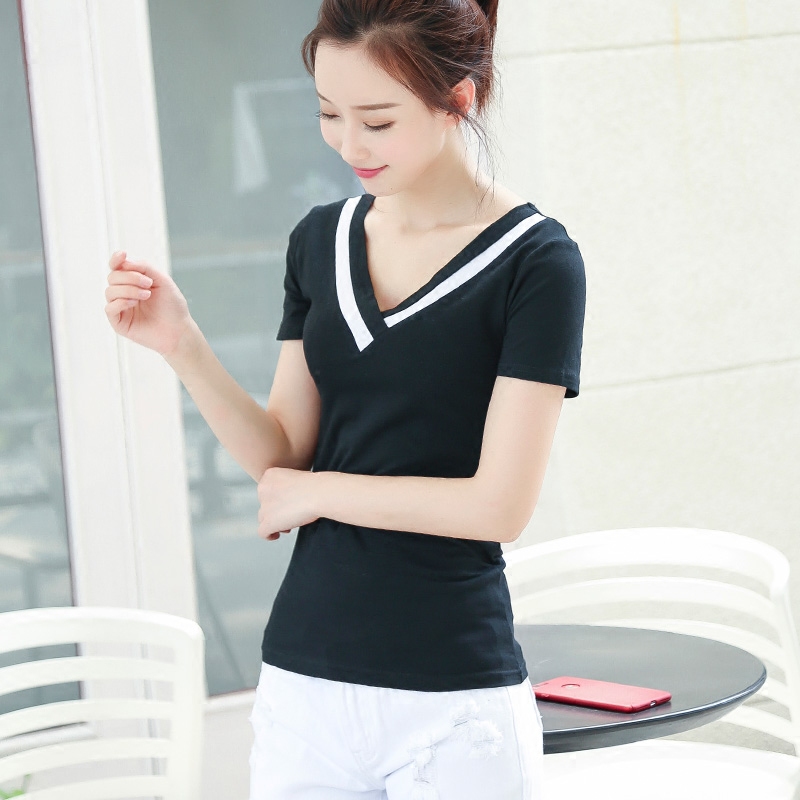 新款拼色短袖V領t恤女士大碼顯瘦簡約百搭打底衫純棉韓版上衣體恤