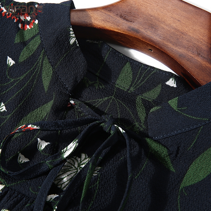 / 夏季寬松雪紡印花泡泡袖百褶連衣裙女裝韓版蝴蝶結中長碎花裙