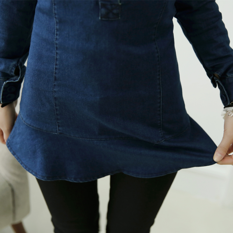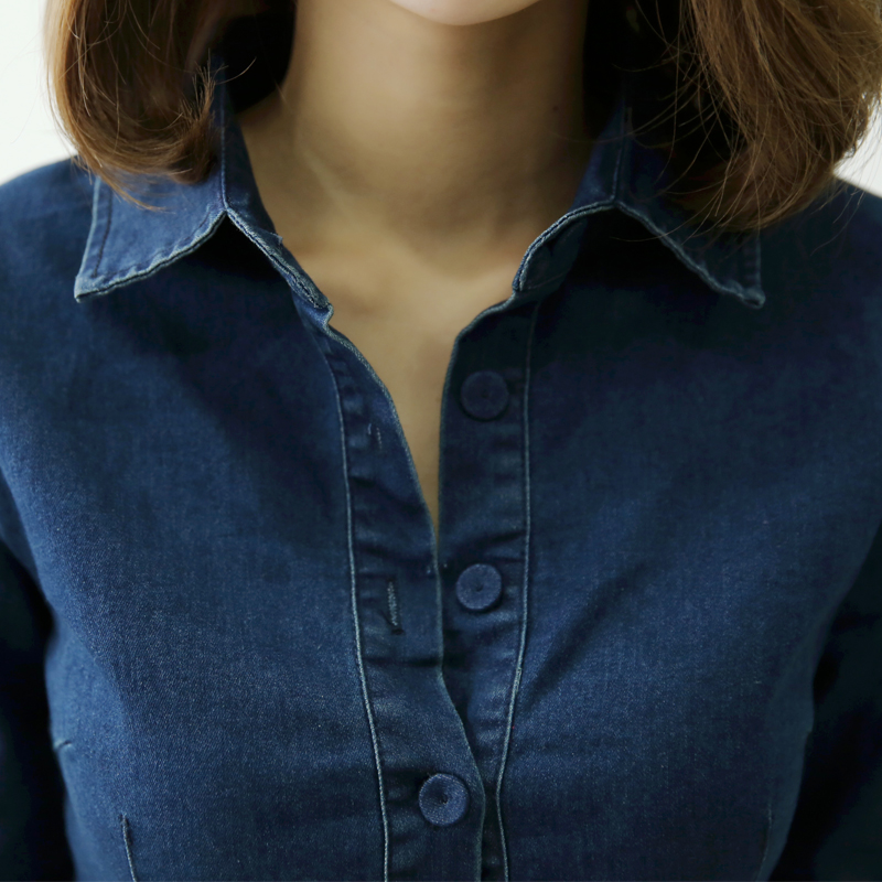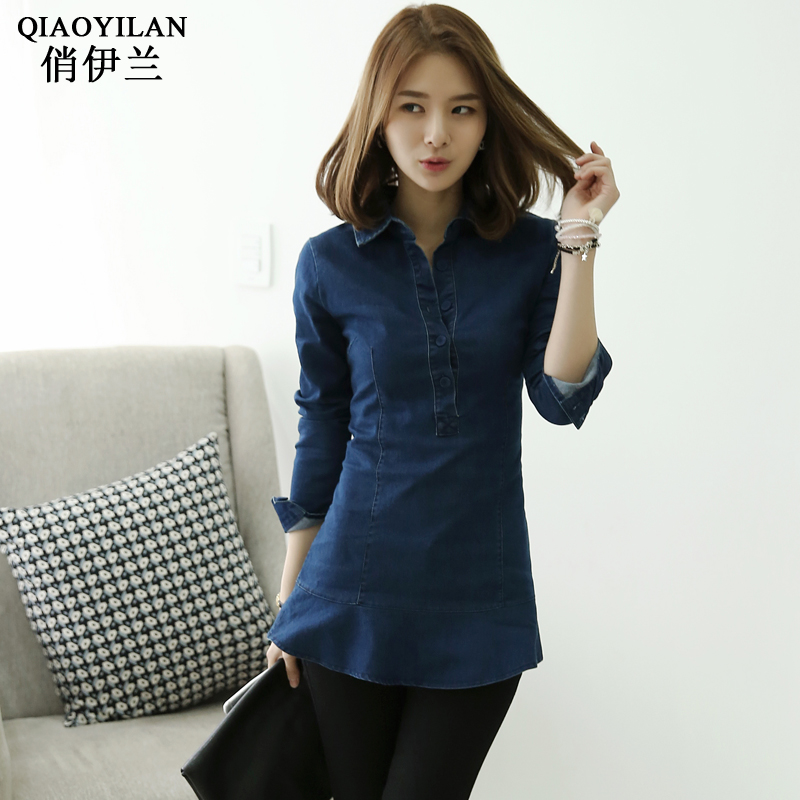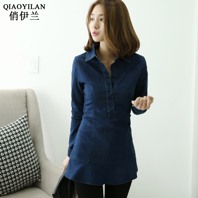 / 中長款牛仔襯衫女修身春裝新款韓版大碼彈力顯瘦長袖休閑上衣潮
