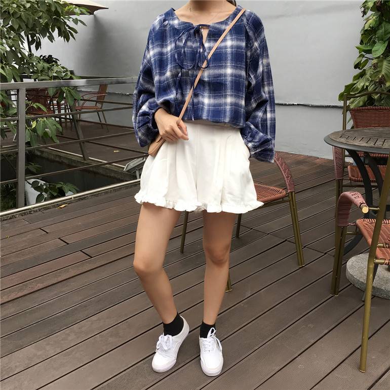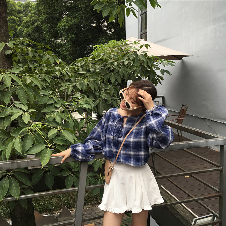 / 韓版寬松系帶女裝格子上衣外套秋冬學生新款套頭百搭長袖打底襯衫