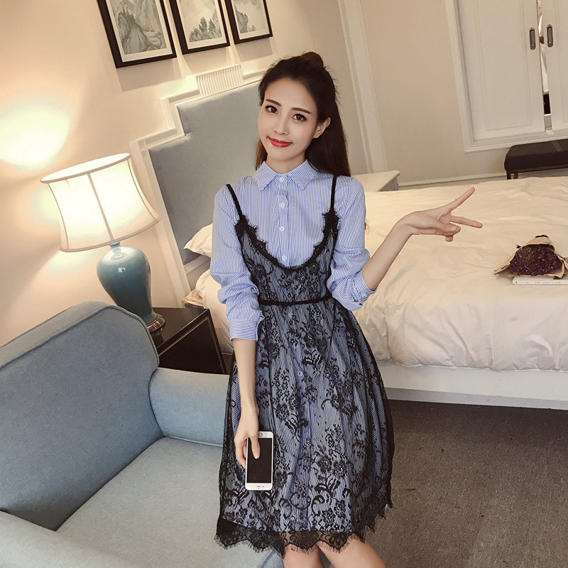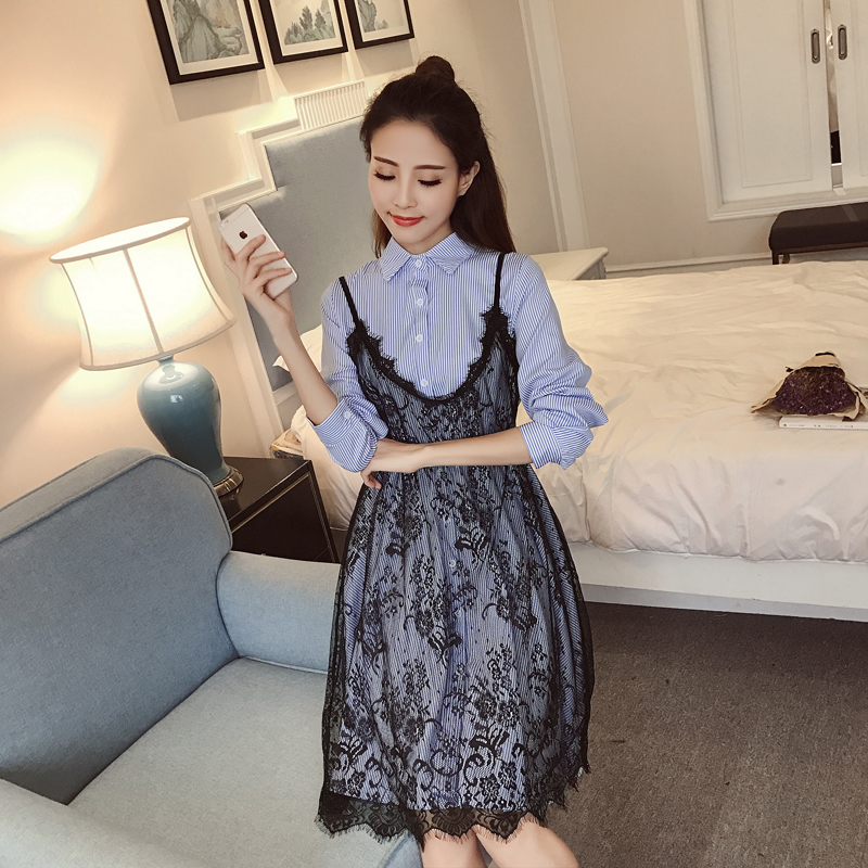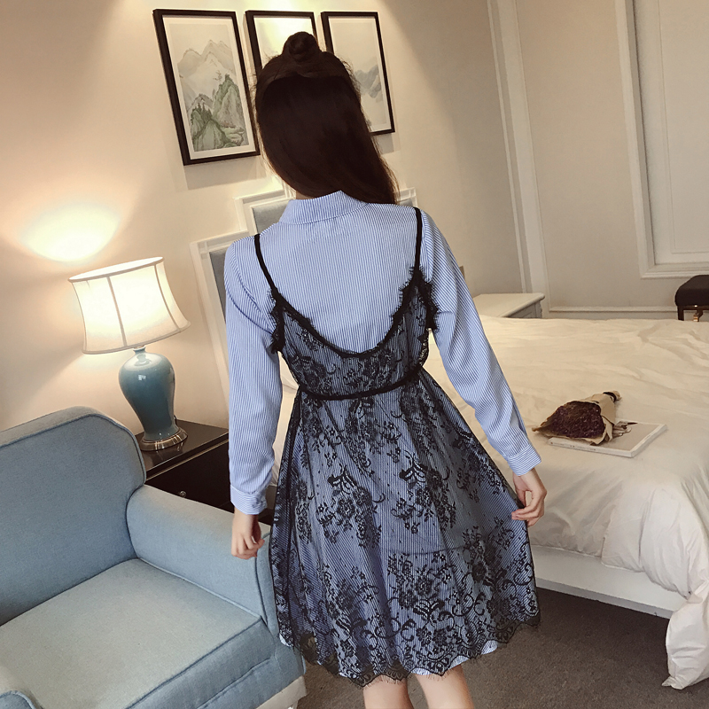 新款女裝韓版蕾絲吊帶裙兩件套收腰顯瘦條紋襯衫長袖連衣裙春