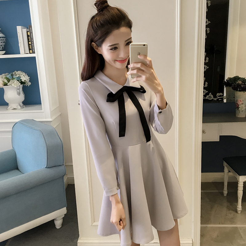 / 早春新款復古赫本小黑裙顯瘦高腰長袖連衣裙秋冬女蓬蓬打底裙