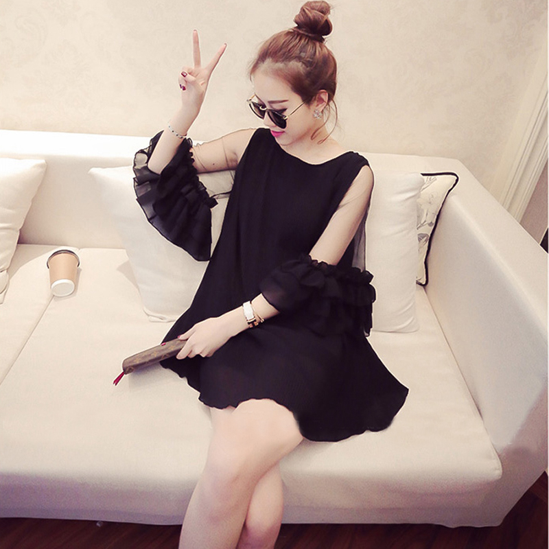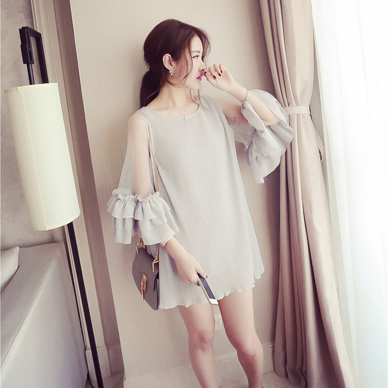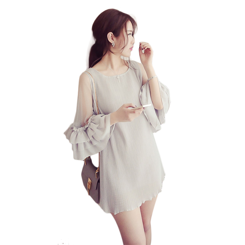 韓版百褶雪紡連衣裙喇叭七分袖寬松網紗拼接短裙女夏海邊度假裙潮