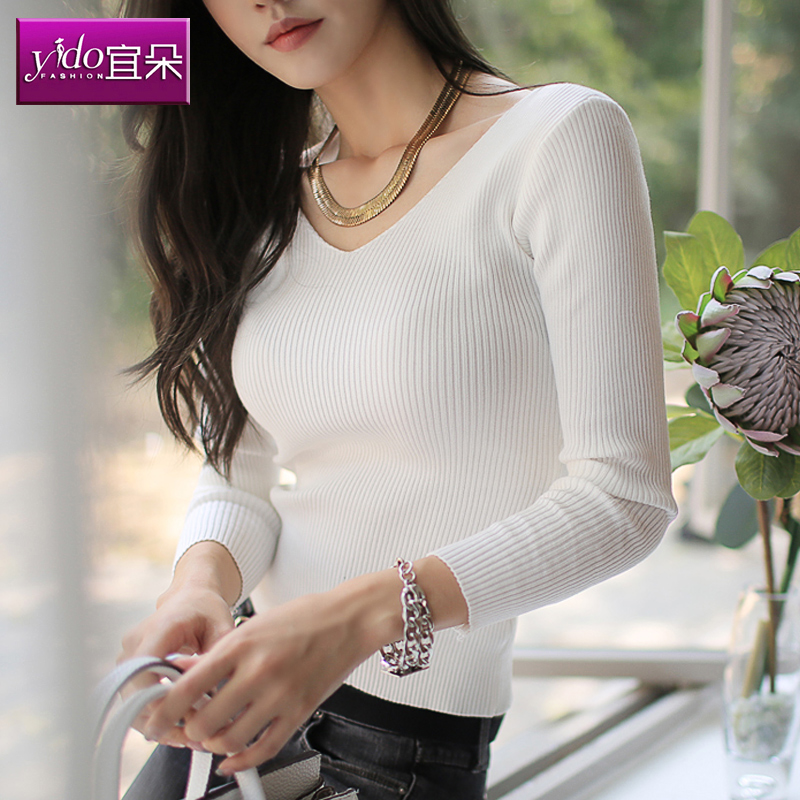 / 白色V領短款針織衫女修身長袖毛衣女春季新款針織打底衫毛衣