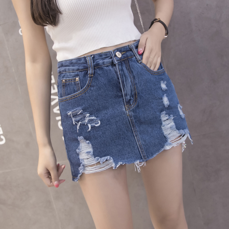 / 破洞牛仔裙半身裙女夏高腰A字裙包臀短裙防走光褲裙磨破半裙