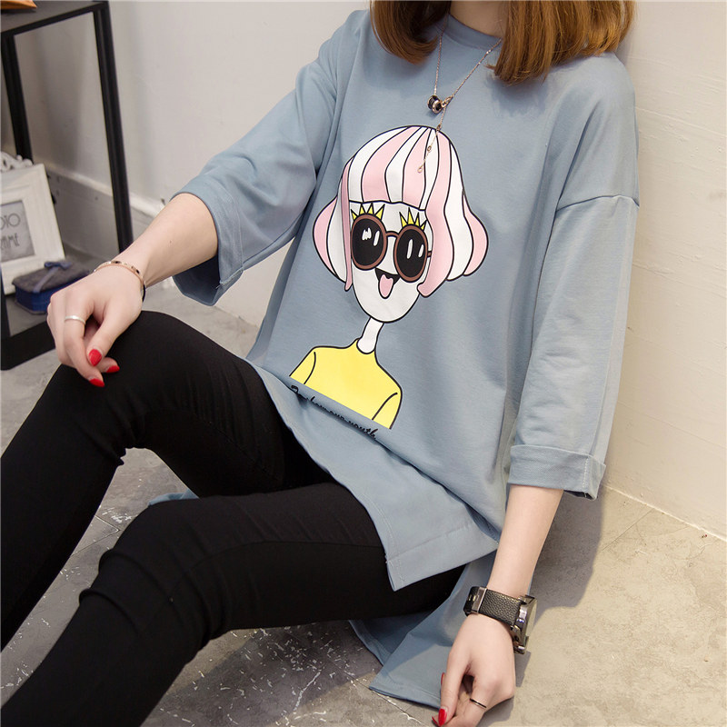 中長款短袖t恤女夏寬松韓版新款學生印花體恤女bf五分袖上衣