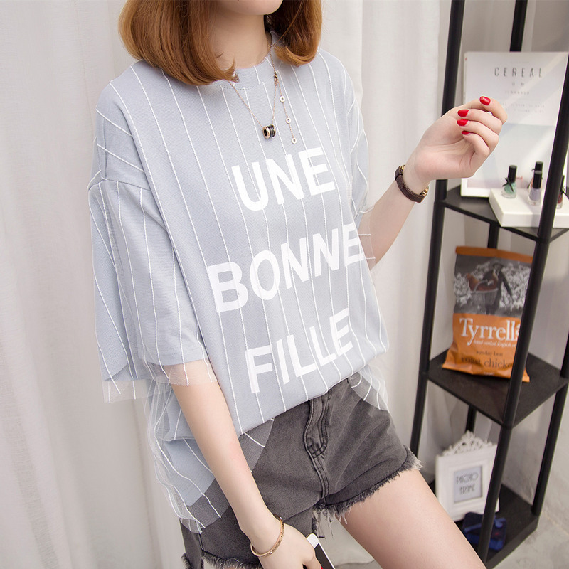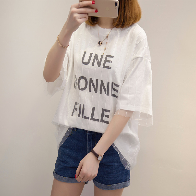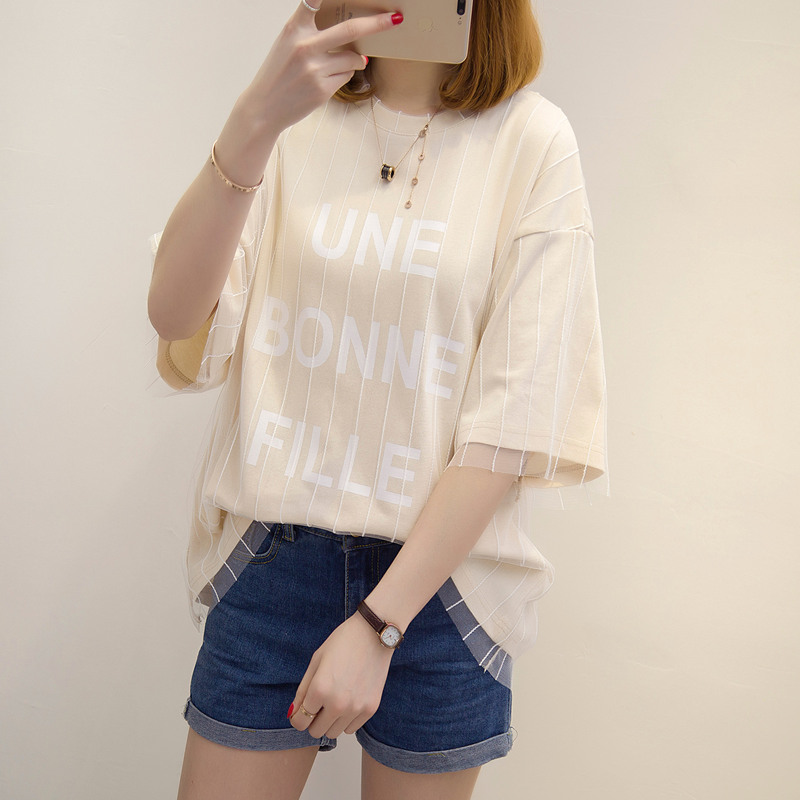 / 女裝春裝新款短袖t恤女防曬衣服女字母中長袖百搭體恤衫上衣