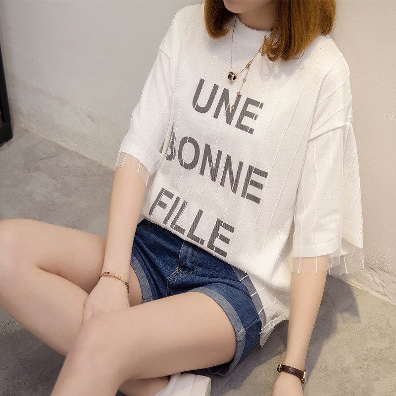 女裝春裝新款短袖t恤女防曬衣服女字母中長袖百搭體恤衫上衣