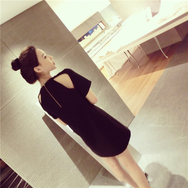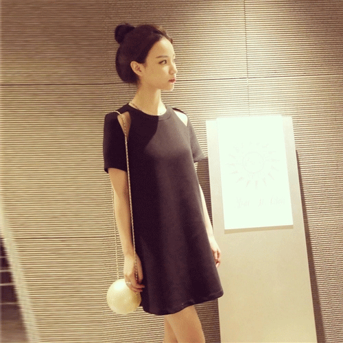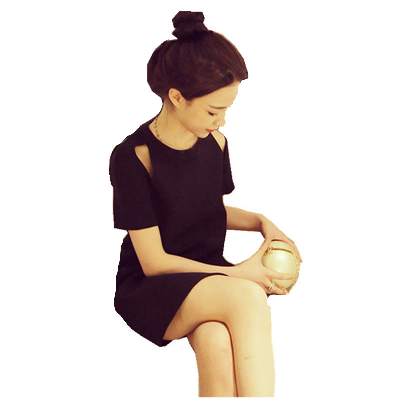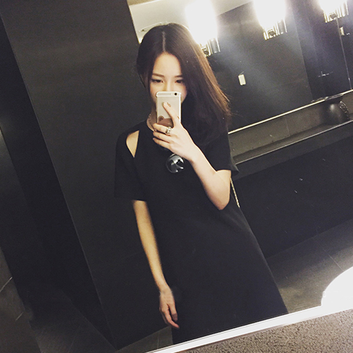 / 夏季新款韓版大碼女裝寬松直筒小黑裙百搭顯瘦露肩短袖連衣裙
