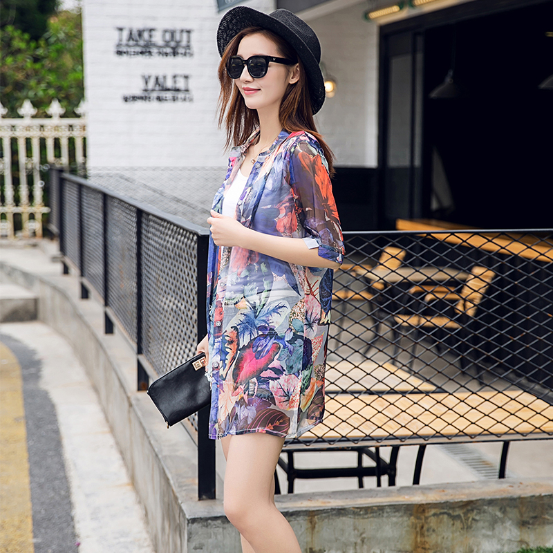 2017戶外夏裝防曬衣女中長款百搭寬松透氣大碼薄款印花沙灘外套