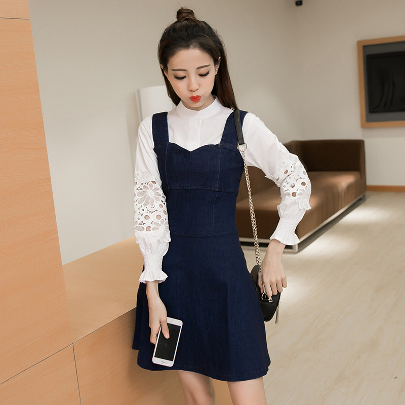 / 早春女裝韓版牛仔背帶裙兩件套修身顯瘦鏤空長袖連衣裙春秋