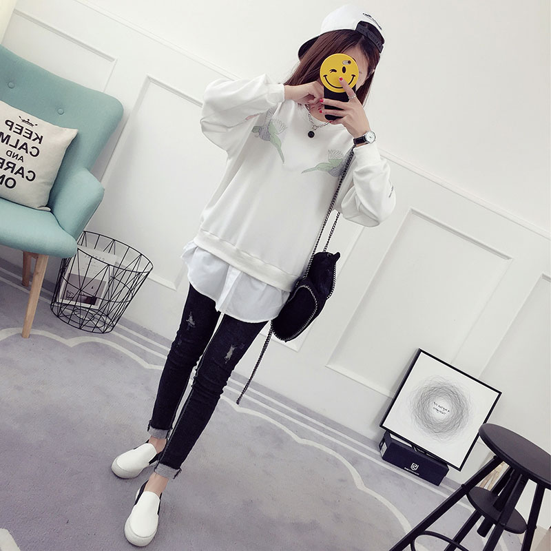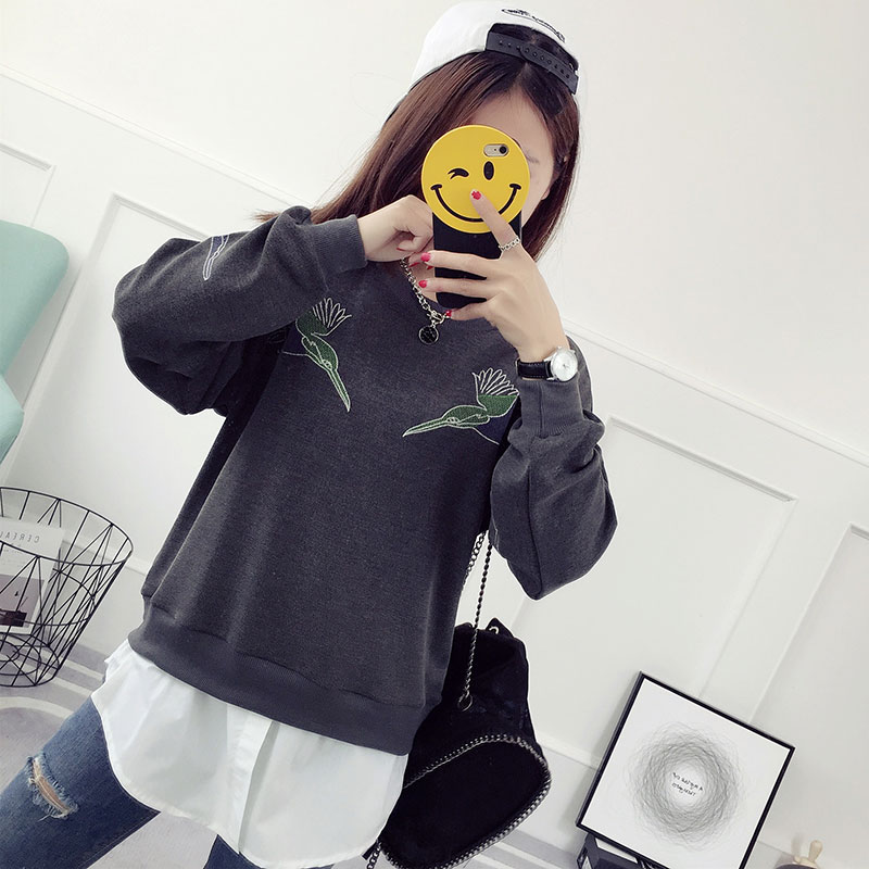 春季韓版潮學生寬松百搭圓領套頭bf中長款假兩件拼接刺繡衛衣女裝
