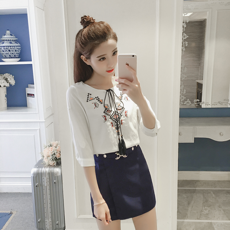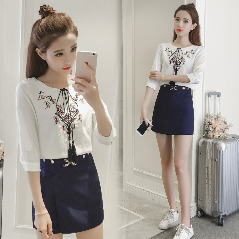 / 春夏季新款女裝韓版時尚刺繡棉麻上衣休閑半身短裙兩件套裝裙