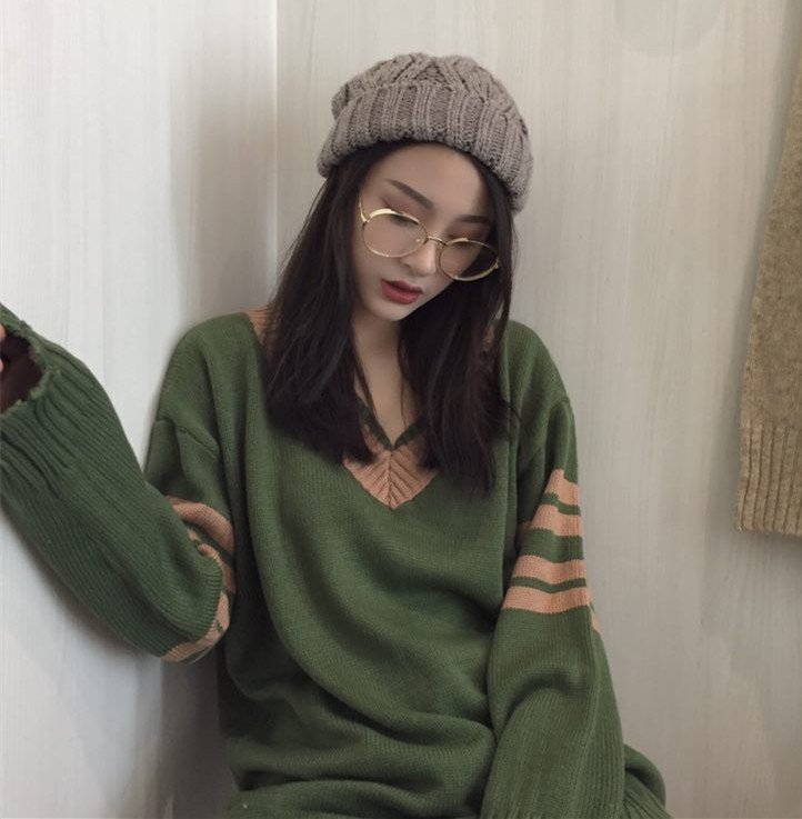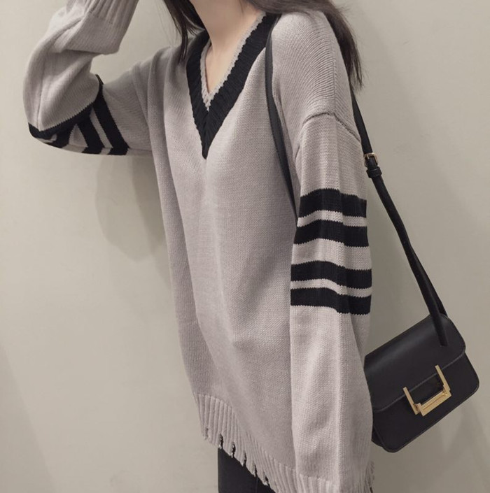 / 韓國chic秋冬撞色條紋v領套頭中長款寬松百搭學生針織毛衣女