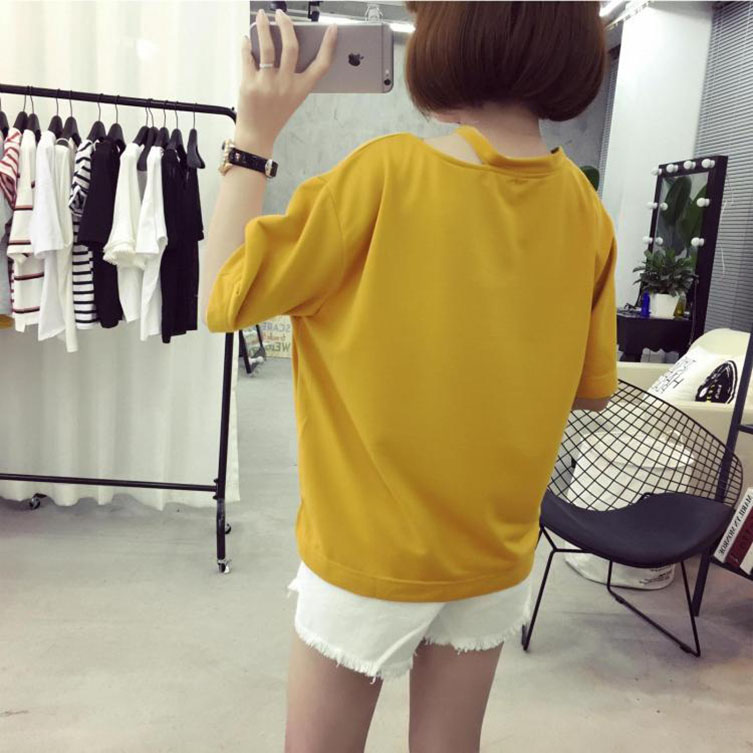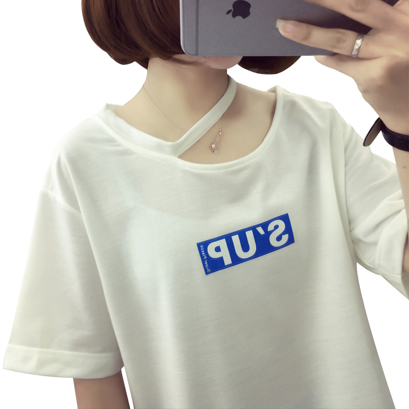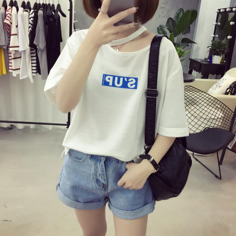 短袖t恤女新款掛脖上衣女字母寬松半袖休閑小衫學生百搭體恤