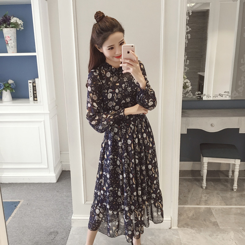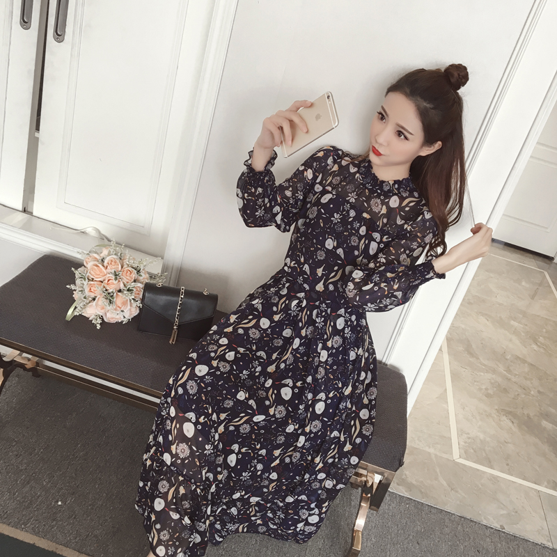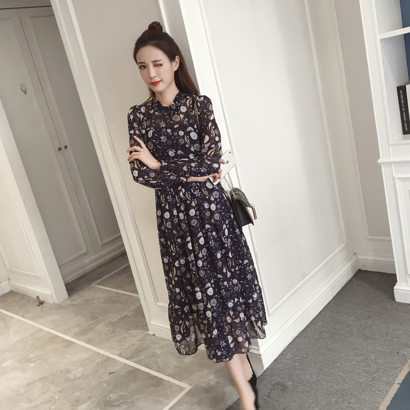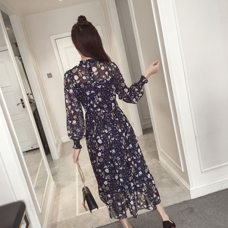 / 春裝新款女裝復古氣質印花中長款裙子收腰顯瘦碎花雪紡連衣裙