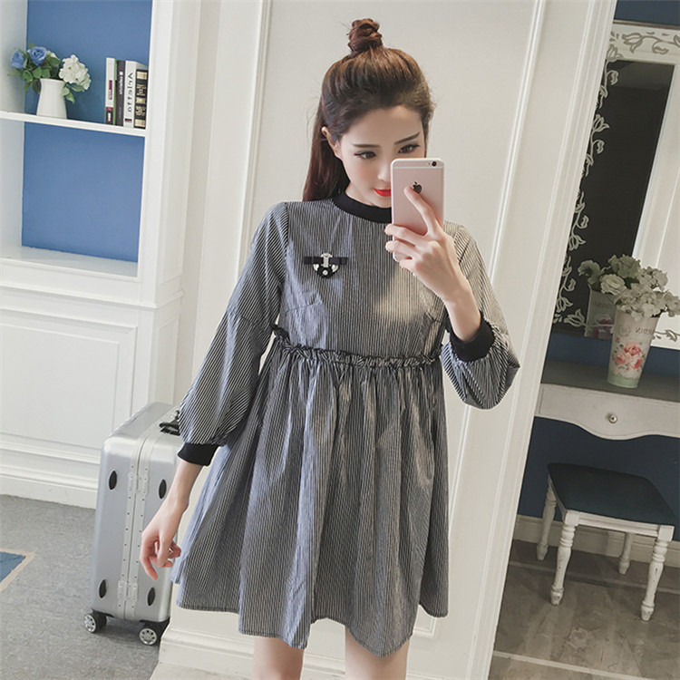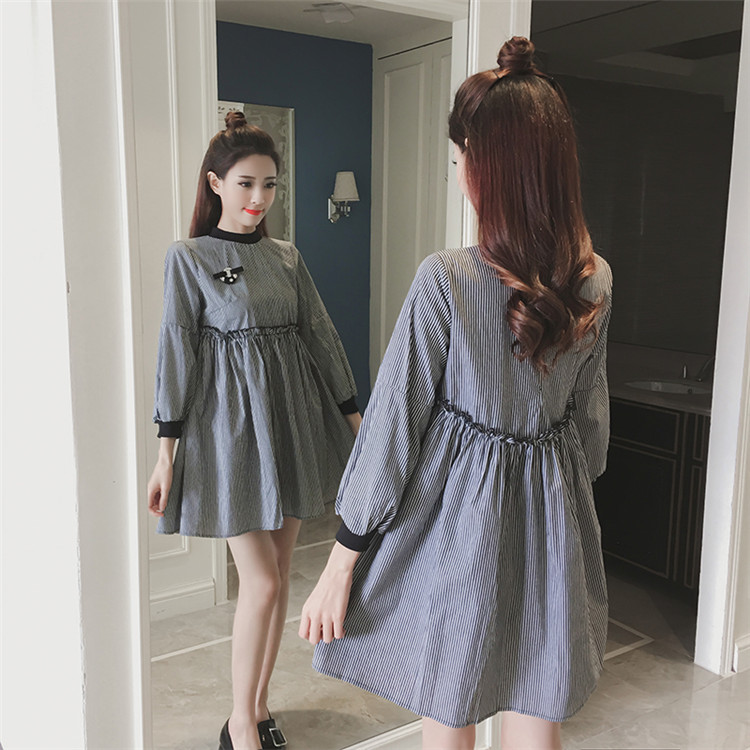 / 春裝新款女裝韓版寬松A字裙女顯瘦中長款條紋長袖連衣裙秋冬