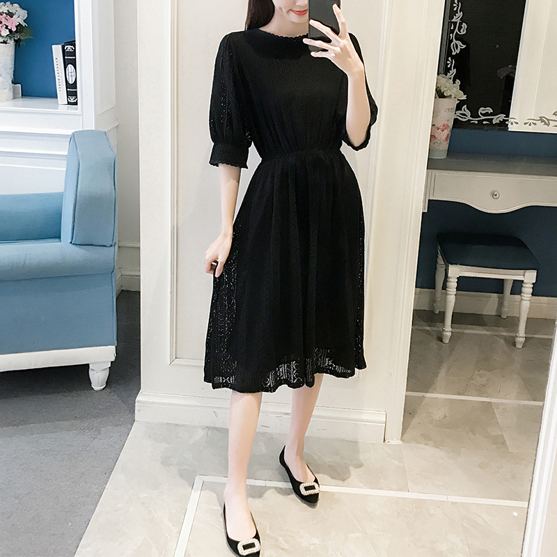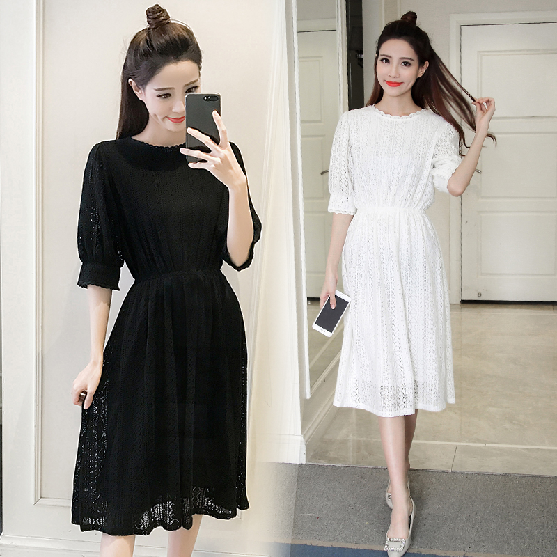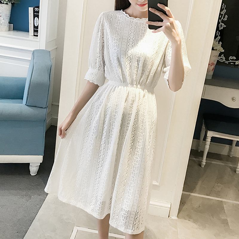 / 春夏季新款女裝韓版小清新中長款修身收腰中袖白色蕾絲連衣裙