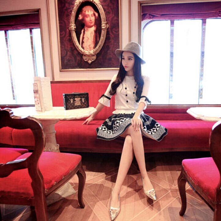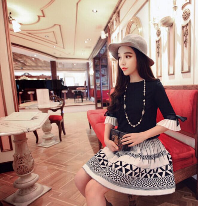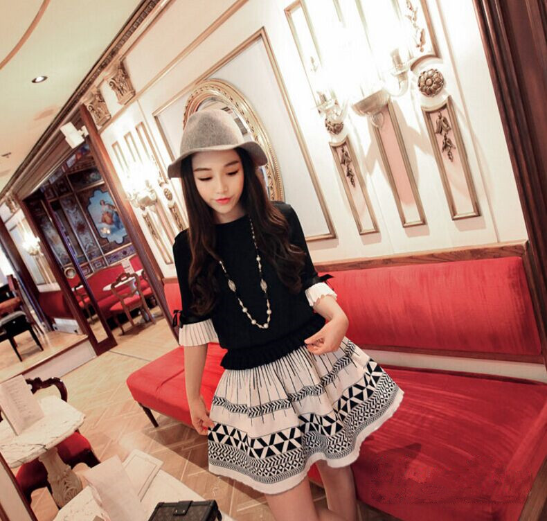 / 秋裝新款女裝韓版兩件套針織連衣裙女顯瘦七分袖印花套裝裙子