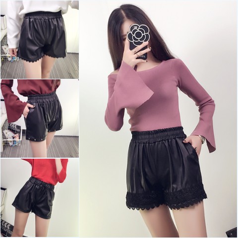 / 秋季新款韓版休閑褲百搭修身顯瘦黑色松緊高腰短褲皮褲熱褲女