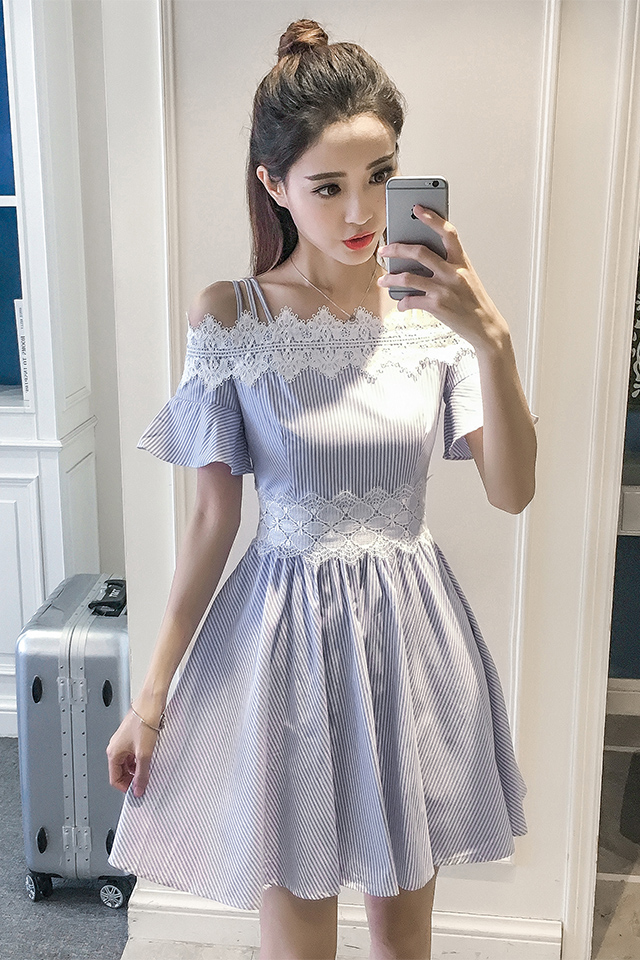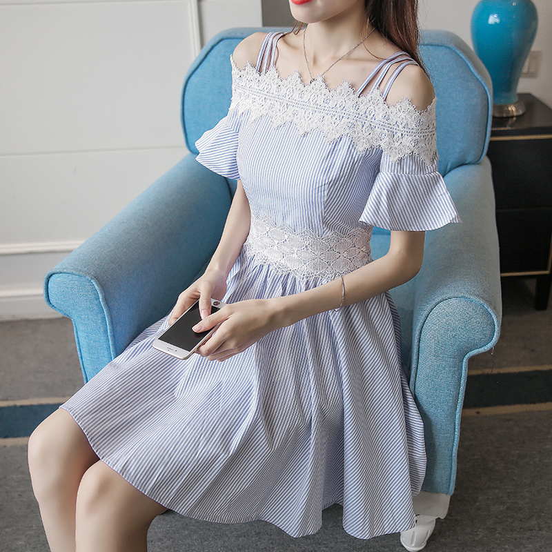 新款女裝韓版蕾絲拼接修身吊帶一字領露肩條紋短袖連衣裙女夏