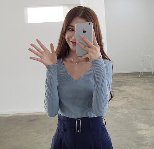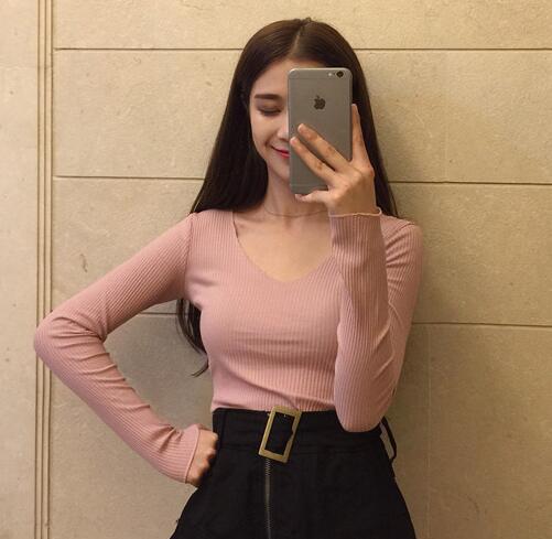 / 秋裝韓國chicV領套頭性感百搭時尚修身顯瘦上衣長袖T恤女打底衫