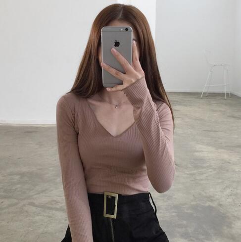 秋裝韓國chicV領套頭性感百搭時尚修身顯瘦上衣長袖T恤女打底衫