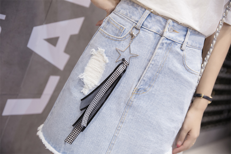 / 高腰牛仔裙半身裙女蕾絲拼接磨破A字裙包臀短裙破洞褲裙半裙夏季