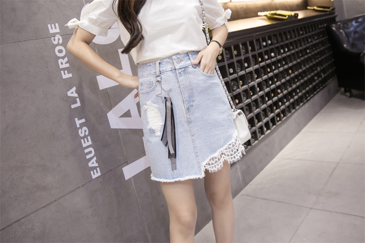 高腰牛仔裙半身裙女蕾絲拼接磨破A字裙包臀短裙破洞褲裙半裙夏季