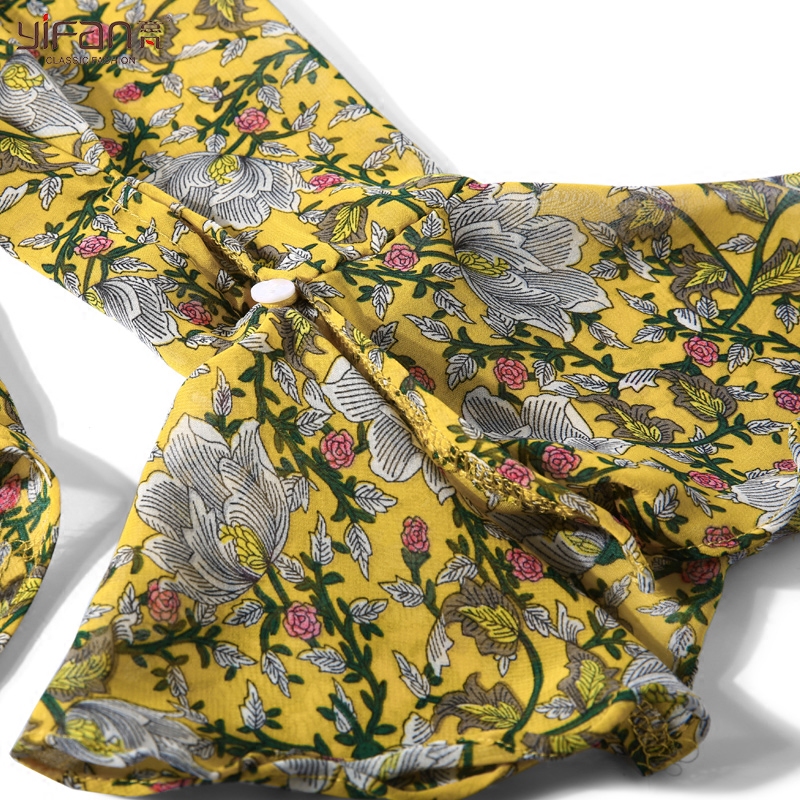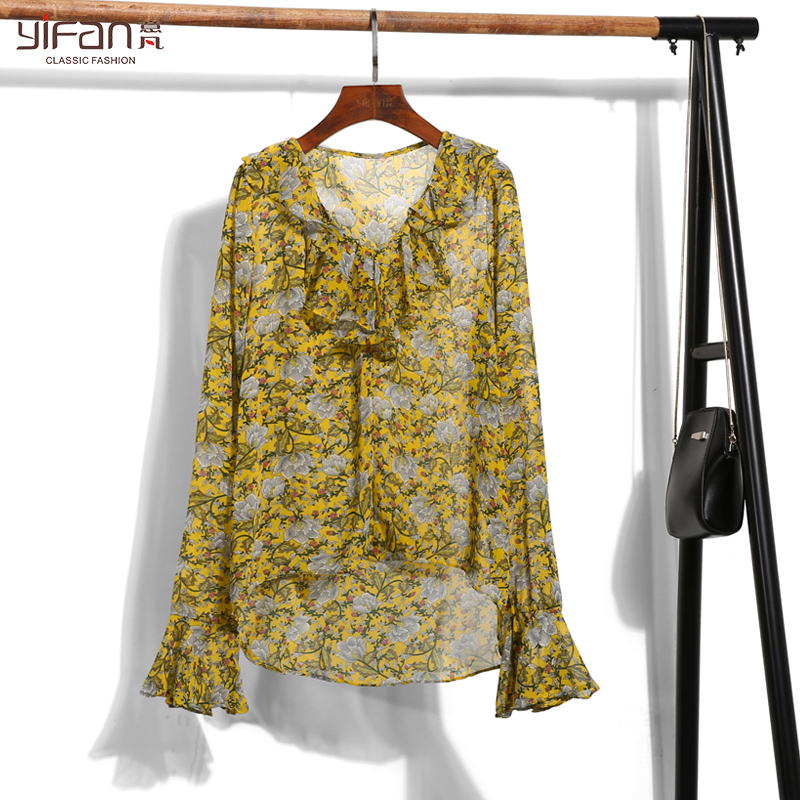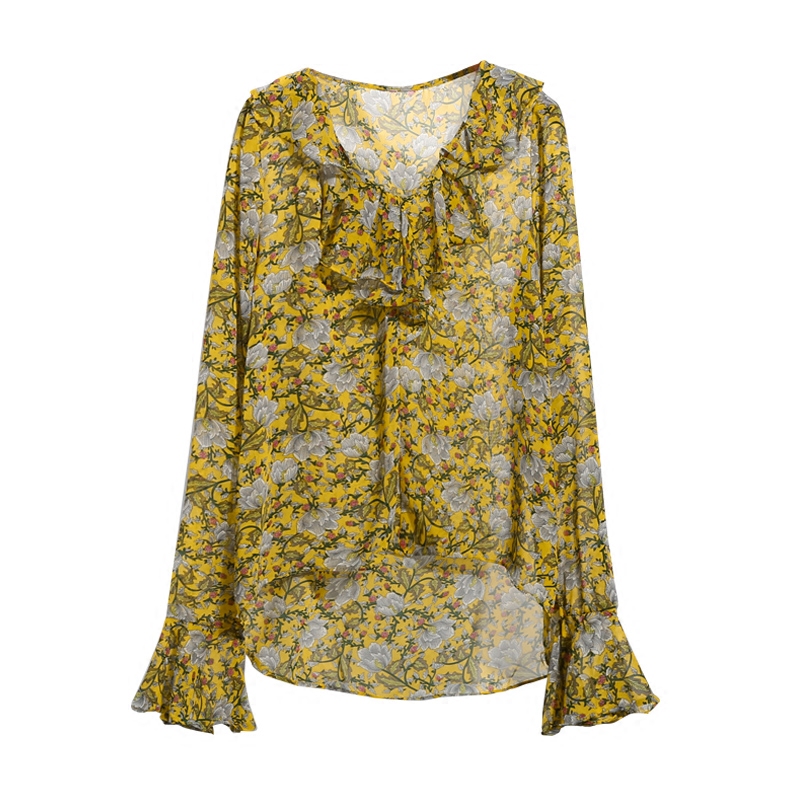 / 韓國氣質荷葉邊V領喇叭袖碎花長袖雪紡衫女小清新薄款上衣防曬衫