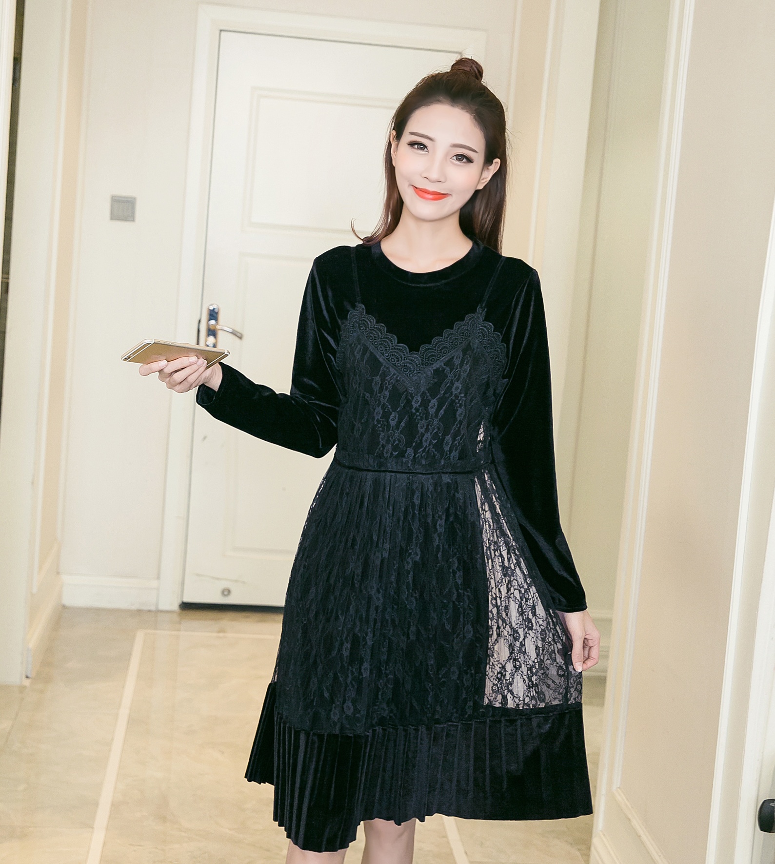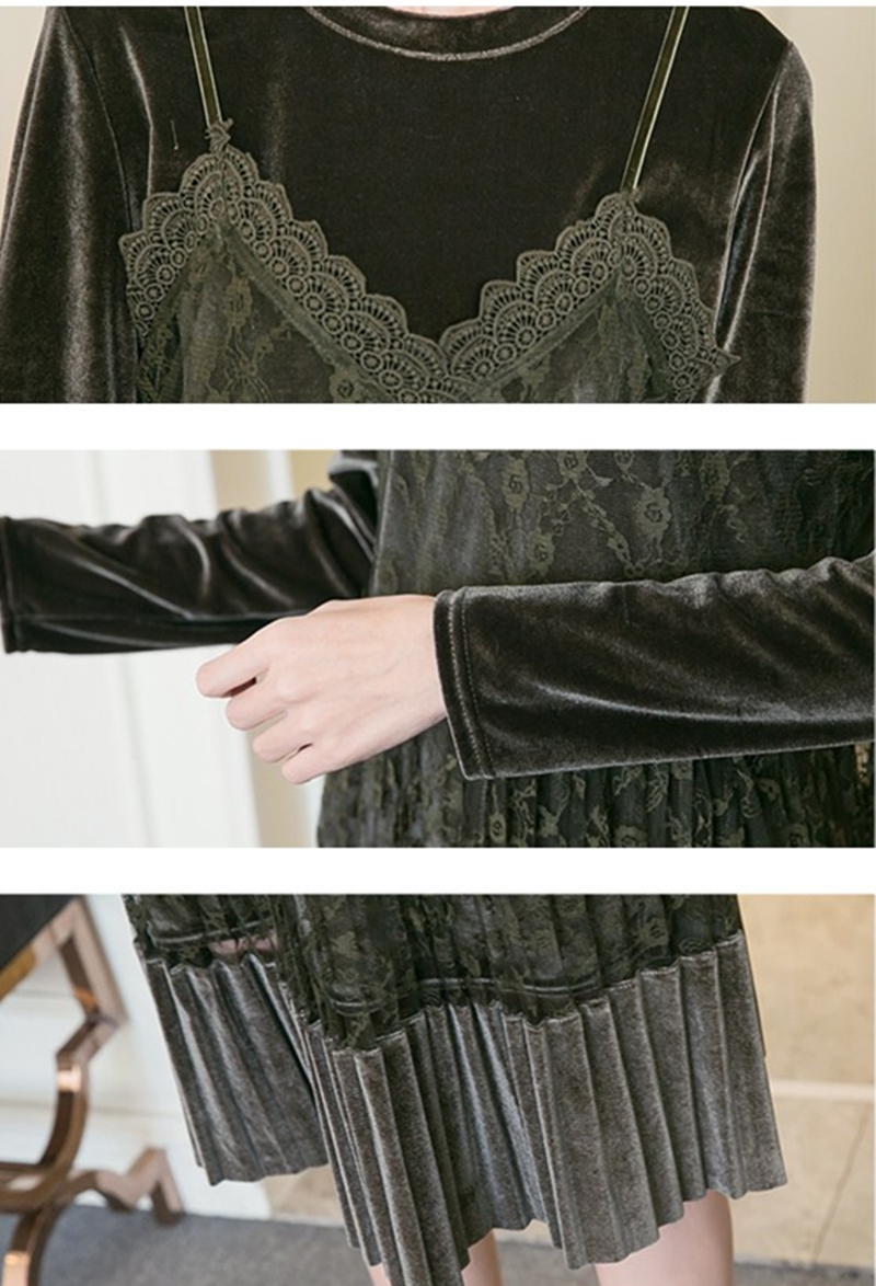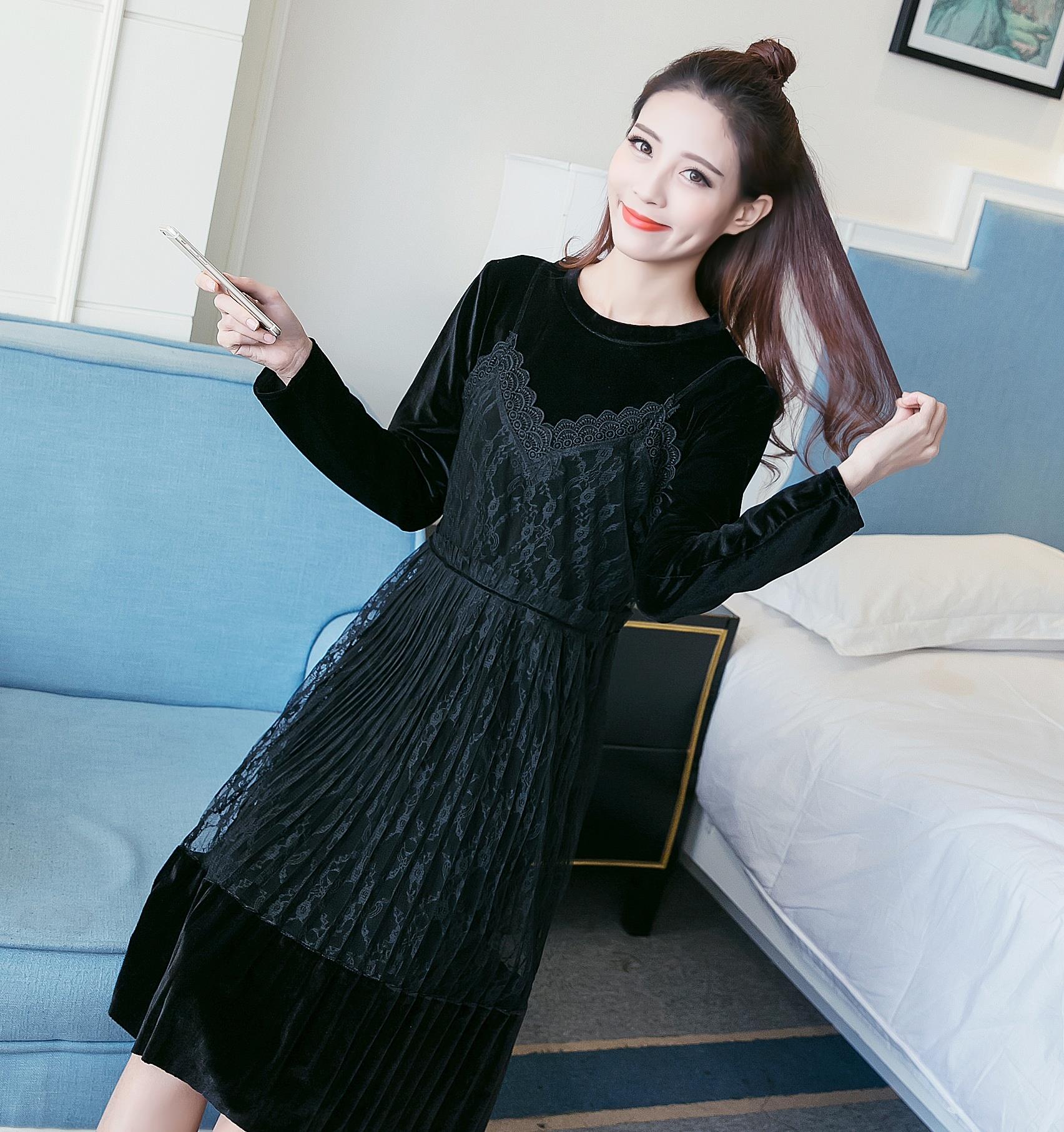 / 初春新款女裝韓版中長款蕾絲吊帶裙兩件套修身絲絨長袖連衣裙