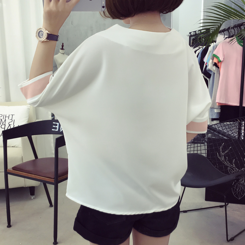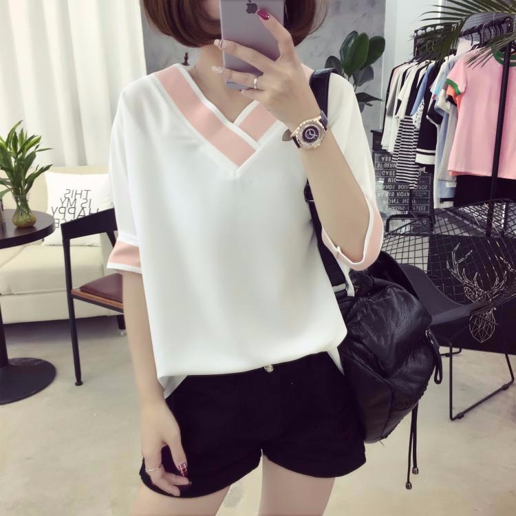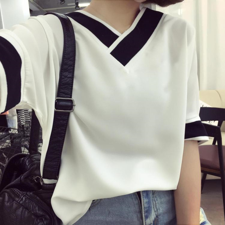 韓國簡約夏裝t恤女寬松夏季半袖打底衫潮拼色V領短袖上衣大碼體恤