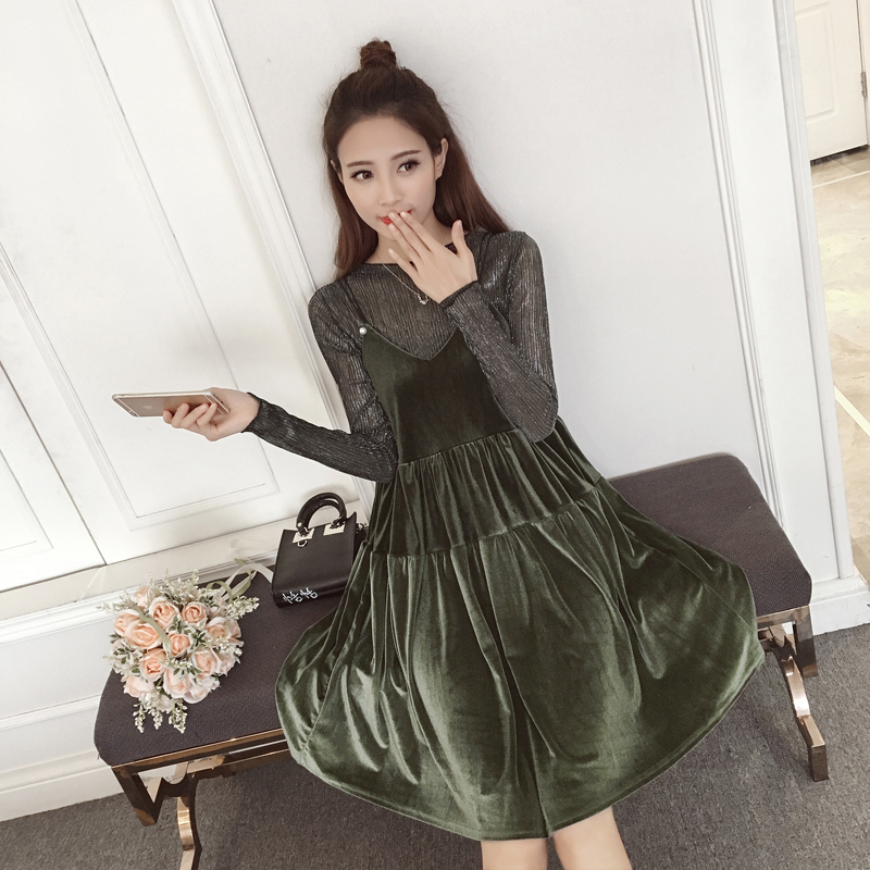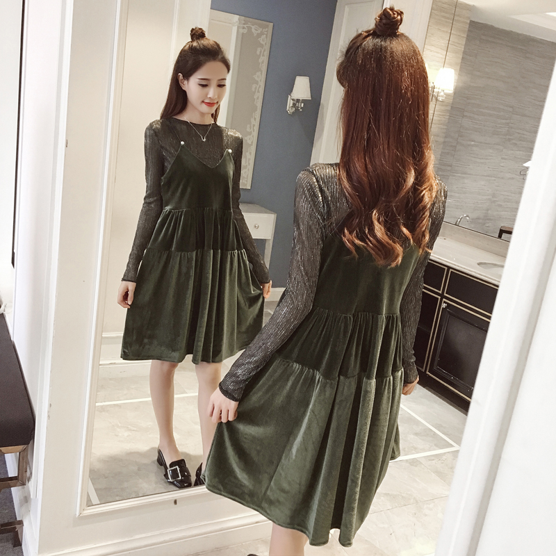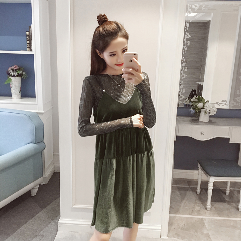 / 春裝新款女裝韓版絲絨吊帶裙兩件套顯瘦長袖打底連衣裙套裝潮