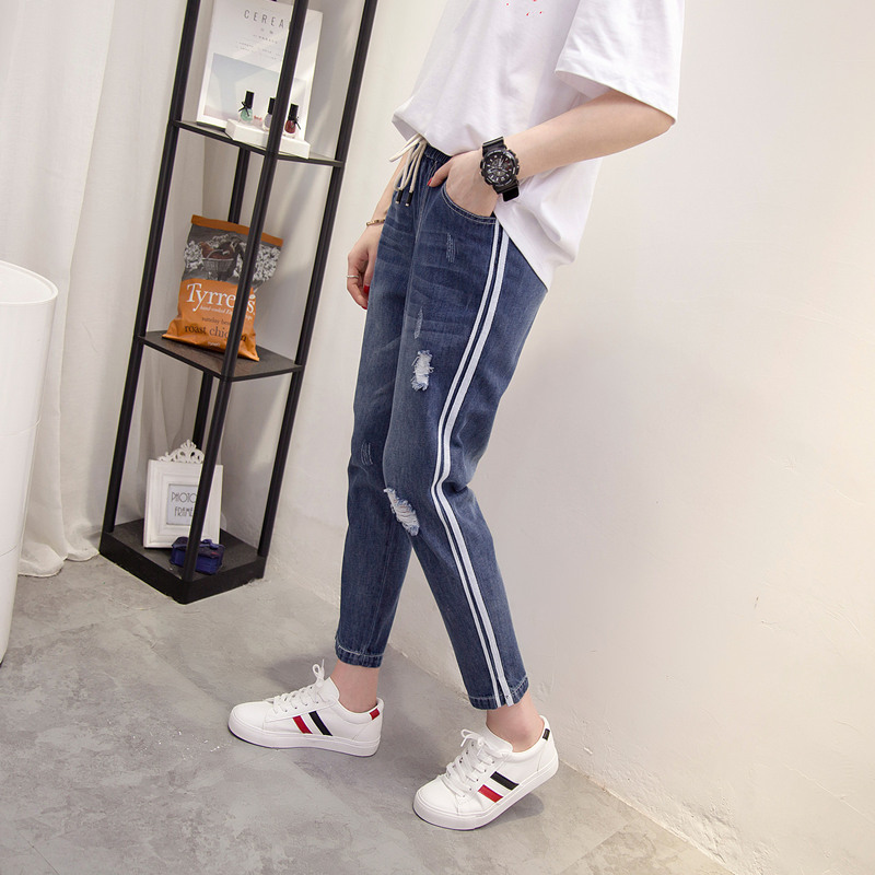 破洞牛仔褲女春夏季新款寬松顯瘦條紋低腰褲子韓版系帶小腳褲