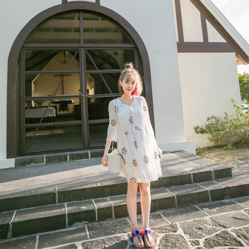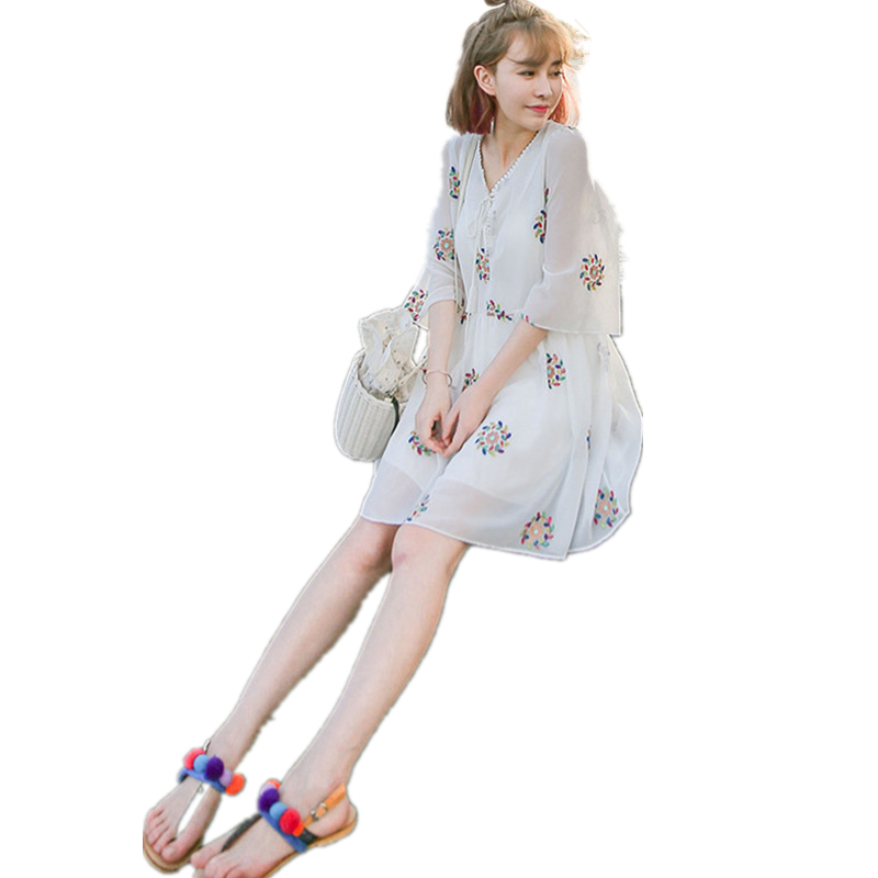 / 新款波西米亞短裙沙灘裙海邊度假刺繡連衣裙夏小清新雪紡裙子