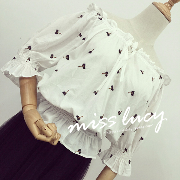 / 夏裝新款韓國寬松刺繡木耳邊系帶一字肩套頭短款雪紡衫上衣女