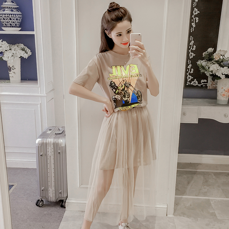 / 夏季新款女裝韓版網紗兩件套裝裙子中長款修身顯瘦短袖連衣裙
