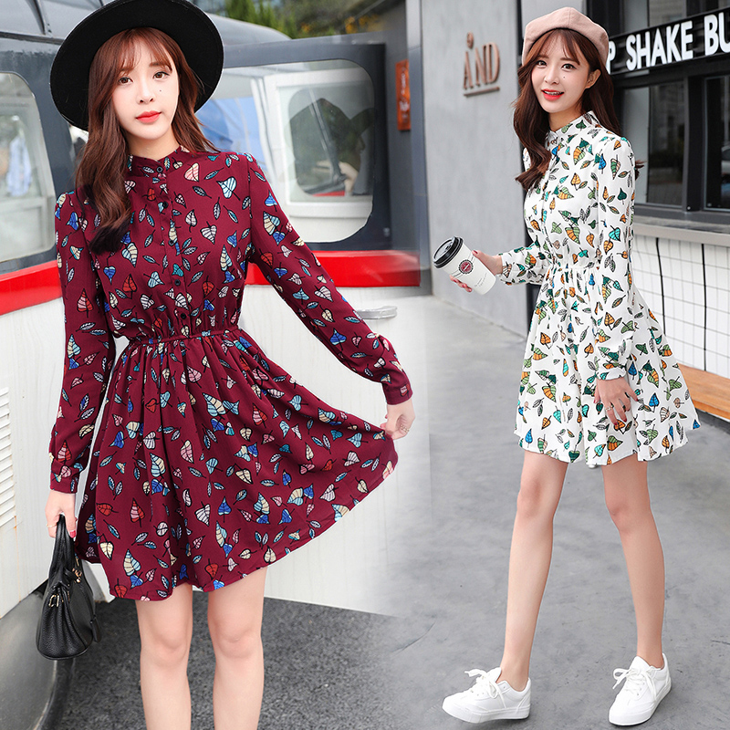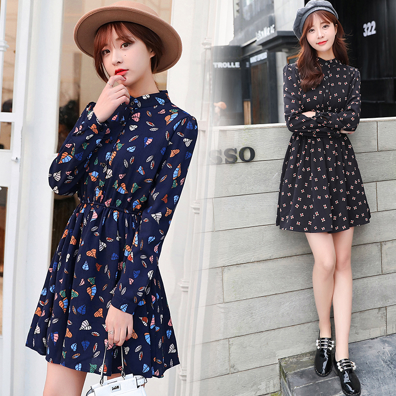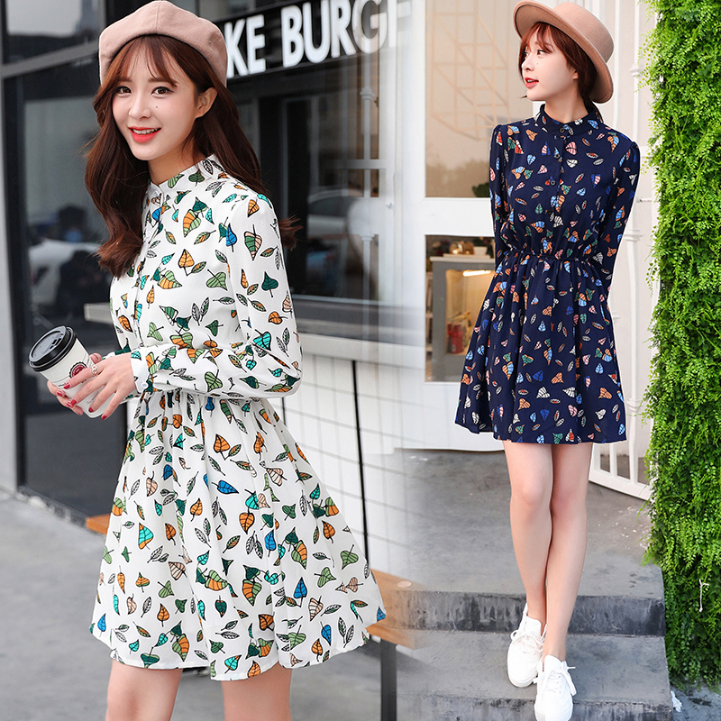 / 韓版春裝印花長袖連衣裙女雪紡碎花裙子大碼a字裙中長款夏小清新