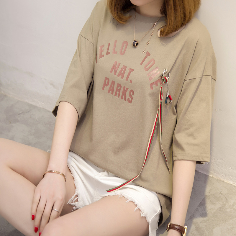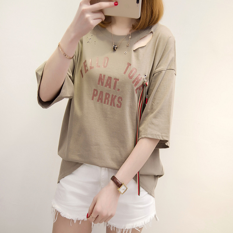 短袖上衣女夏新款破洞鏤空白色t恤女中長袖寬松韓版打底百搭