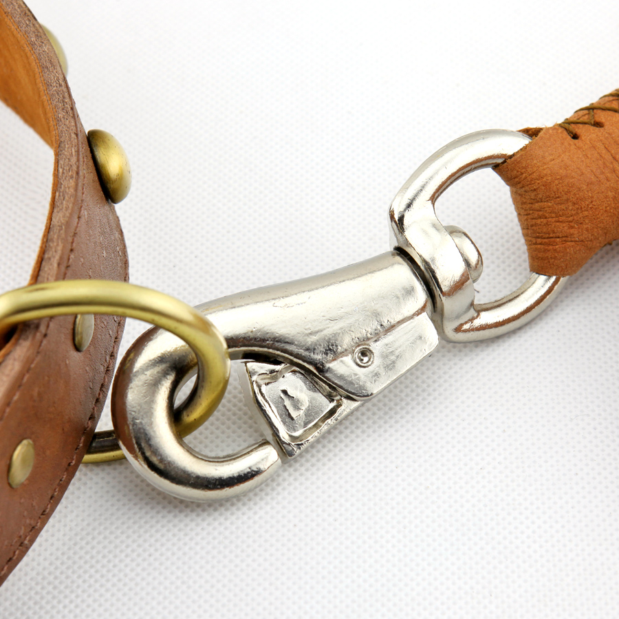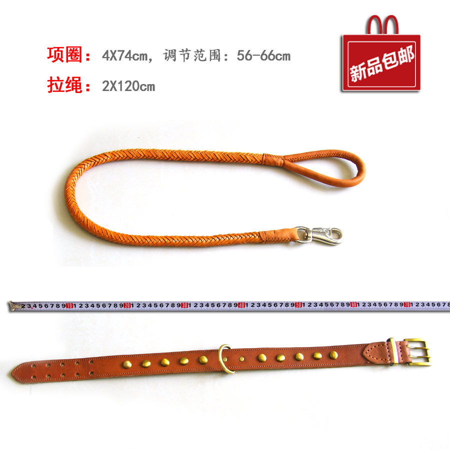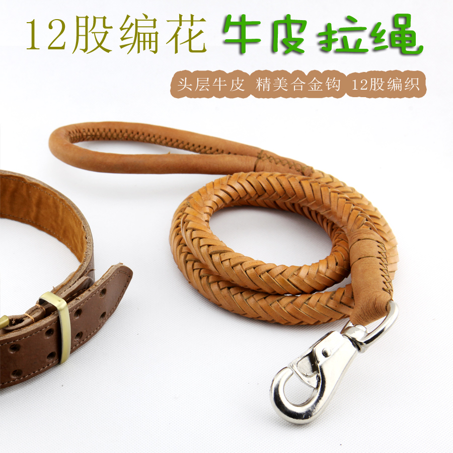 / 加粗12股編花牛皮牽繩大中型犬牽繩項圈套裝德牧金毛藏獒狗鏈包郵