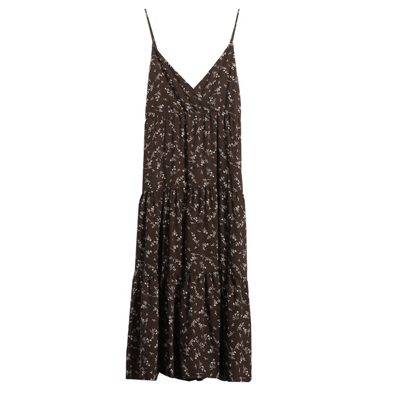 新款復古雪紡連衣裙女荷葉邊V領中長款顯瘦百褶裙碎花吊帶裙夏季