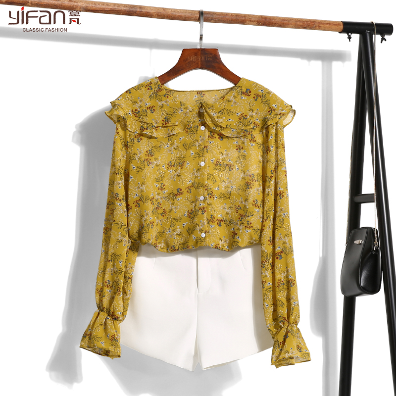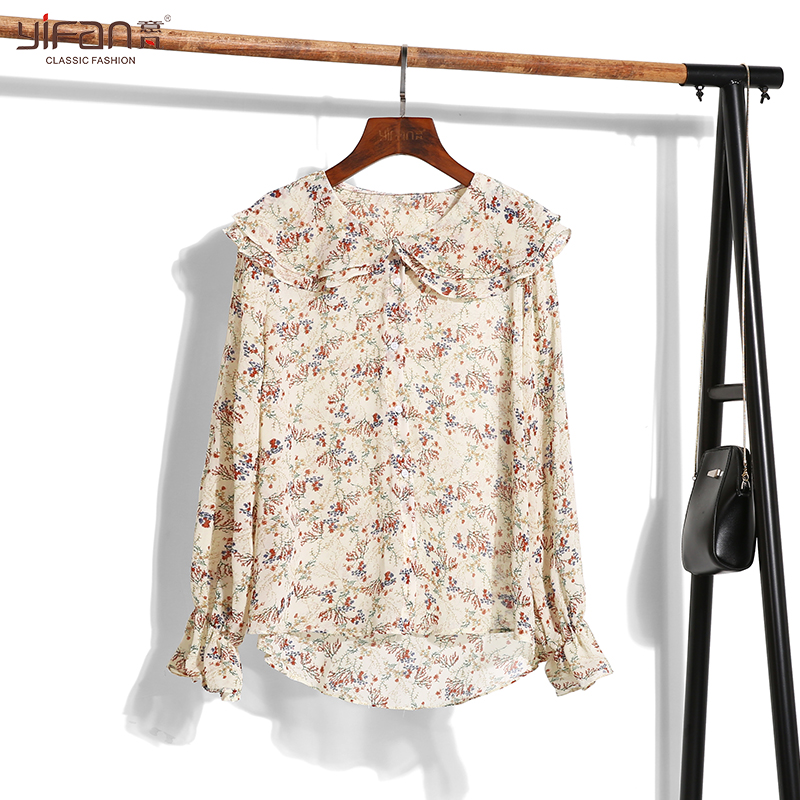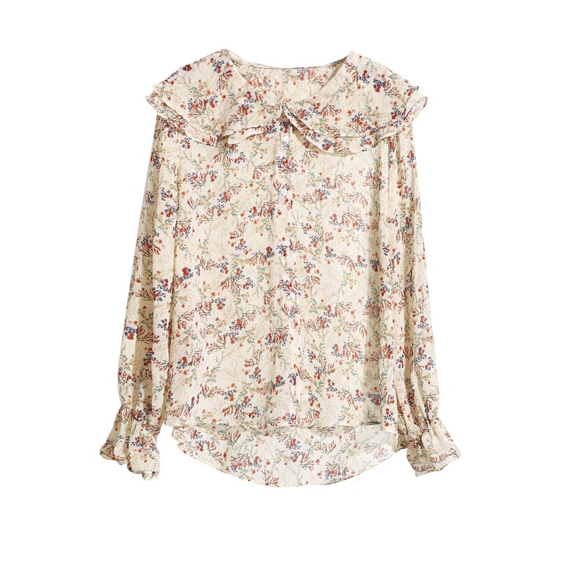 / 春夏韓國甜美小清新碎花荷葉邊娃娃領長袖雪紡襯衫女印花雪紡上衣