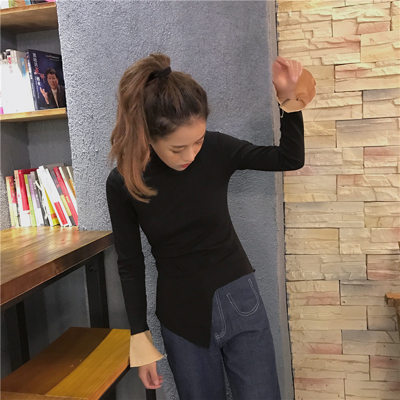 / 韓國東大門秋冬chic高領百搭荷葉袖套頭純色修身打底衫T恤女
